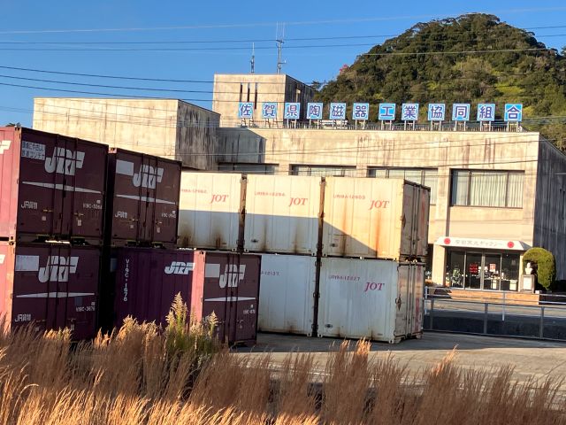 さらにホームを歩いていくと、コンテナ置き場のようなものがありました。その背後に、「佐賀県陶磁器工業協同組合」の看板のかかった建物が見えます。