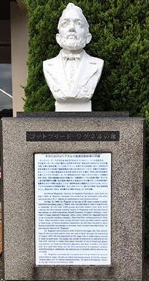 写真を拡大すると、一階部分に、「有田窯元ギャラリー」というショップの名前が見えます。しかも、その隣に白い胸像が設置されています。この写真でははっきりしないので、調べてみると、ワグネル(Gottfried Wagener, 1831- 1892)の胸像でした。明治初期に鍋島直正に招聘され、有田で技術指導を行った人物です。