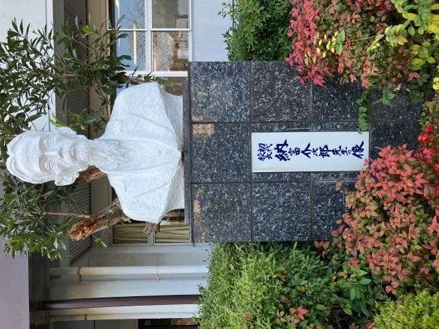 駅の背後に山が見えます。小高い山々に囲まれた有田で、二つの白い胸像に出会いました。維新期に、陶磁器業界の近代化に大きく貢献したワグネルと納富介次郎の胸像です。いずれも、信念の強さ、ピュアな志を表現しているかのような眩しいばかりの白が印象的でした。(2025/12/29 香取淳子)