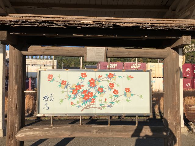 2025年12月15日午後二時過ぎ、ようやく有田駅に着きました。駅員がチケットを回収するシステムの駅でした。背後に小さな山が見えます。下車したホームの対面に、屋根付きの掲示板のようなものが見えました。ホームの階段を上って渡り、近づいてみると、陶板が展示されていました。