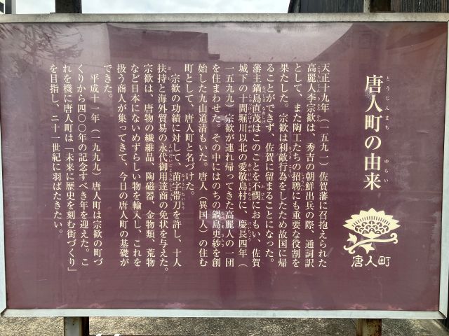 「天正十九(1591)年、佐賀藩に召抱えられた高麗人李宋歓(りそうかん)は、秀吉の朝鮮出兵の際、通詞役として、また陶工たちの招聘(しょうへい)にも重要な役割を果たした。宋歓は利敵行為をしたため故国に帰ることができず、佐賀に留まることになった。藩主鍋島直茂はこのことを不憫におもい、佐賀城下の十間堀川以北の愛敬島村に、慶長四(1599)年宋歓が連れ帰ってきた高麗人の一団を住まわせた。その中にのちの鍋島更紗を創始した九(く)山道(ざんどう)清(せい)もいた。唐人(異国人)の住む町として、唐人町と名づけた」(※「唐人町由来」より)