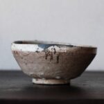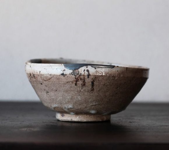 素朴で、重厚感のある茶碗です。やや斜めに傾いた上部に、黒い模様のようなものが見え、興趣を添えています。長石の混じる灰釉が下の方までかかっており、奥深い風情があります。形といい、色合いといい、質感といい、力強く印象的な茶碗です。