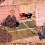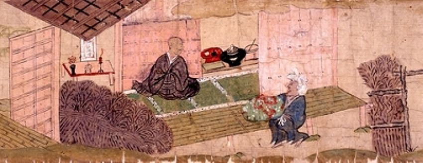 室町時代の僧侶の間では、茶を飲むことは日常の楽しみであり、また来客をもてなす重要な作法でもありました。このシーンは、老僧が世俗から離れて過ごす日常の一端が示されています。